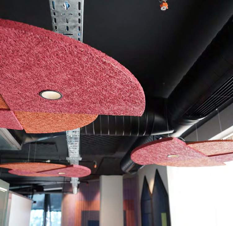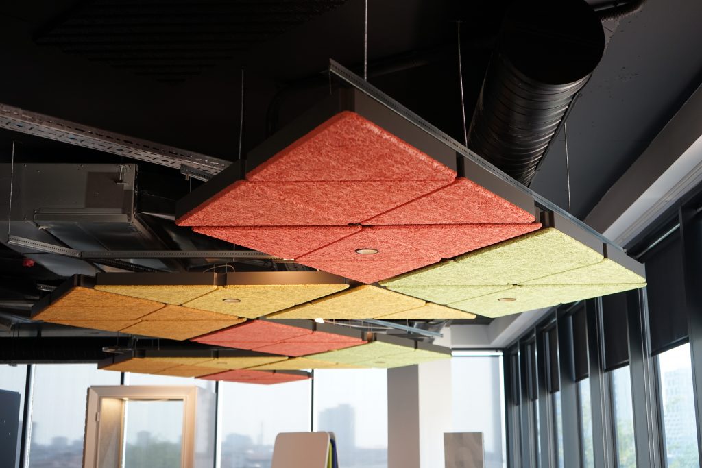 SENS Cloud, mekanlarınızdaki yankı ve yansımaları kontrol etmek için tavana asılan modüler ahşap yünü panellerdir.