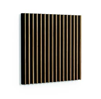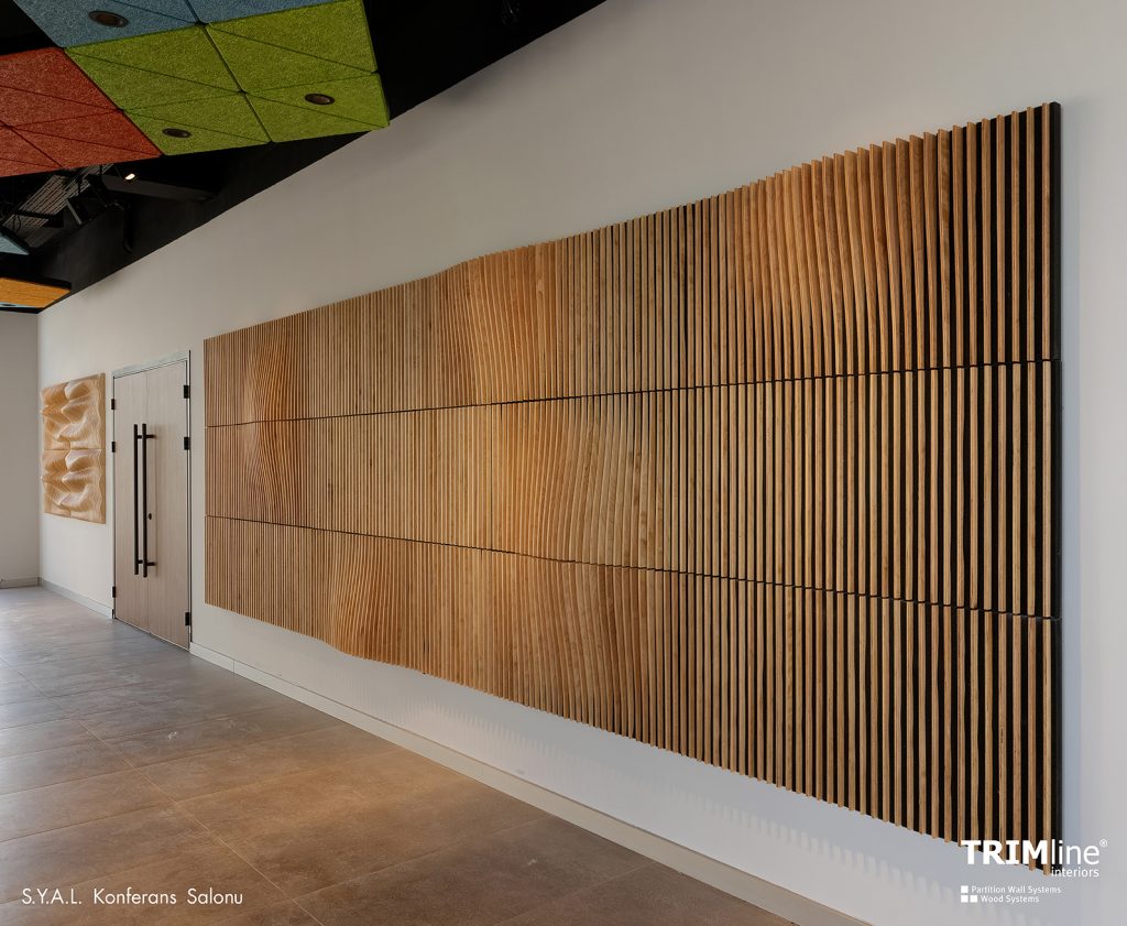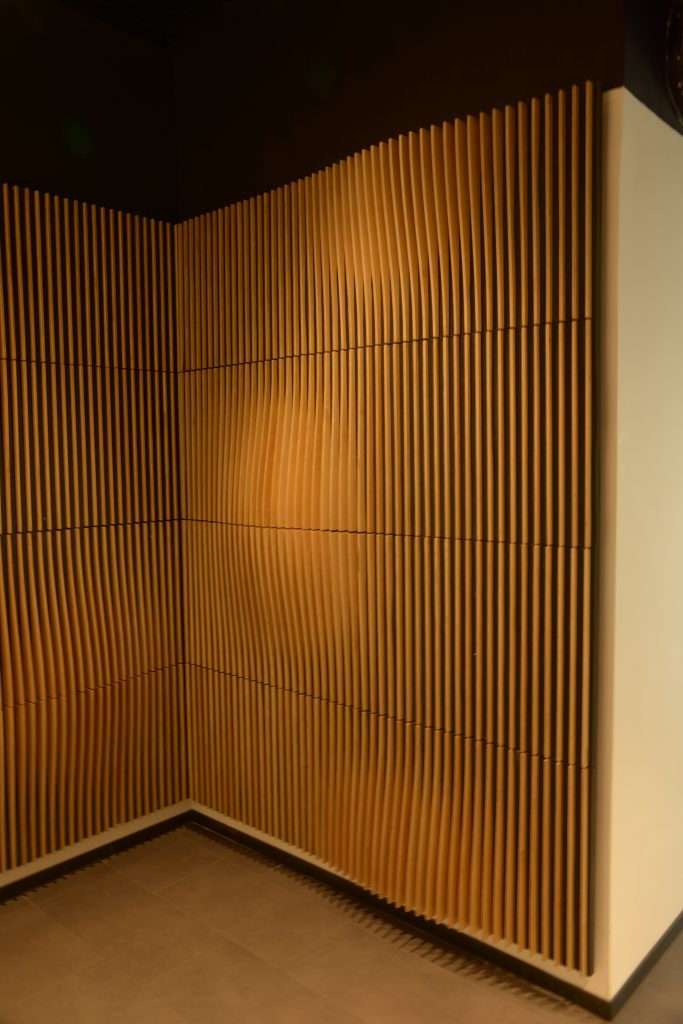 Doğal ahşap panellerden oluşan modüler akustik paneller